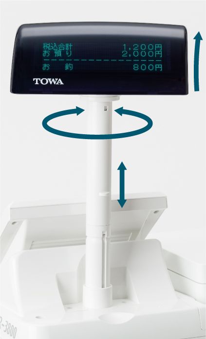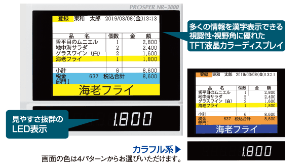 TFT液晶カラーディスプレイにより、品名などを漢字で複数行にわたって表示可能(登録時/設定時)。カーソル指定による訂正(削除)処理も可能です。さらに、合計金額や、釣銭金額などの確認が確実に行えます。設置ロケーションに合わせて角度・輝度の調整が可能です。