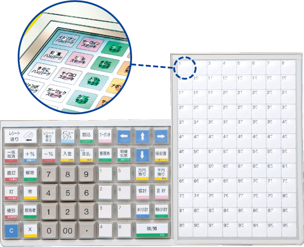 メニューキーに商品名と単価があらかじめ設定できるので、売上操作が簡単・スピーディーに行えます。またメニューを直接選ぶので、登録ミスを未然に防ぎ、正確な会計が行えます。