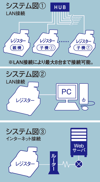 ①最大8台(親機 1台、子機 7台)の親子接続(IRC接続)が可能です。レジ間でのデータを共有するとともに、親機での集中管理が可能です。