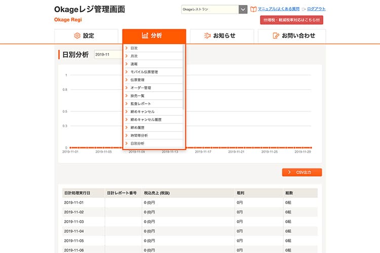 メニューの更新だけでなく、日次分析、カテゴリ分析、ABC分析など各種、売上分析機能も備えており、日々の経営管理を効率的に強力にサポートします。